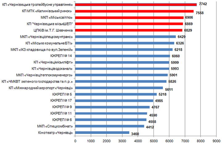 Так, найбільший розмір середньомісячної заробітної плати на одного працівника (з нарахуваннями) за 2017 рік був у КП «Чернівецьке тролейбусне управління» і складав 7740 грн., далі йдуть КП МТК «Калинівський ринок» 7560грн. та МКП «Міськсвітло» 6910 грн.