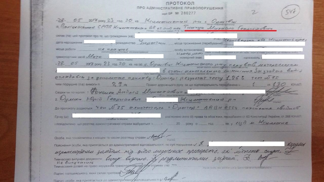 У результаті поліцейські все ж оформили протокол за їзду в стані алкогольного сп'яніння. Вони самі написали пояснення порушника та розписалися за нього, свідки були підставні.