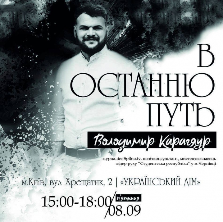 Прощання з чернівчанином, журналістом Спільно.ТБ Володимиром Карагяуром, що загинув в ДТП 6 вересня, відбудеться у п’ятницю, 8 вересня, в Українському домі у Києві (вул. Хрещатик, 2), з 15.00 до 18.00. Хоронитимуть журналіста - у суботу, 9 вересня, на Одещині.