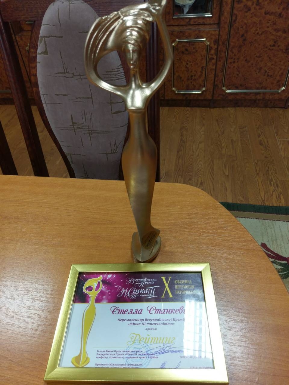 Всеукраїнська Премія «Жінка ІІІ тисячоліття» - це нагорода, яку вручають щорічно в Національній Опері України українським жінкам, які зробили значний внесок у певну галузь та реалізовувалися у різноманітних сферах діяльності. Статуетка, яку отримала пані Стелла символізує силу і витонченість, підкреслену суворість і зворушливу тендітність - головні риси Сучасної Жінки. Фігурка втілює лагідну жіночність і постійне прагнення досконалості та успіху, незламну силу й красу її духу, недосяжну для вітрів час.
