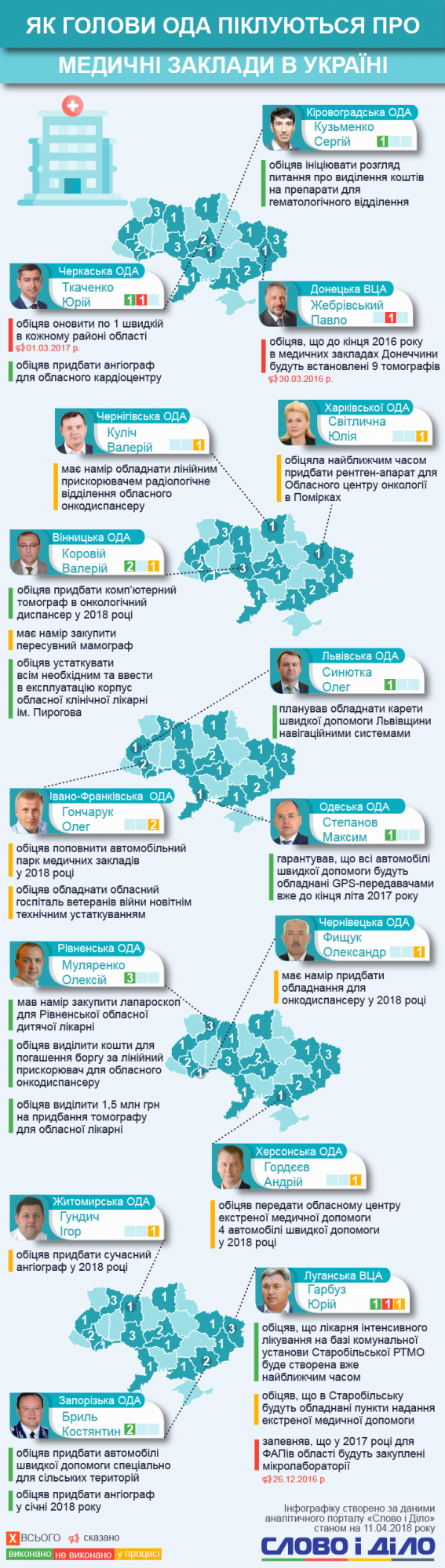 Портал «Слово і Діло» створив інфографіку, яка показує, що голови облдержадміністрацій обіцяли і виконали у модернізації медичних установ. Як виявилося, Олександр Фищук, голова Чернівецької ОДА, дав лише одну обіцянку - у 2018 році придбати обладнання для Чернівецького обласного онкологічного диспансеру. Однак поки цей намір у процесі виконання. Про найефективніших губернаторів України, що виконали свої обіцянки, - в інфографіці.
