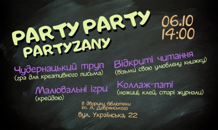 6 жовтня у дворику бібліотеки ім. А.Добранського (вул. Українська, 22) пройде вечірка в стилі «Bring your own booze» (Принось випивку із собою).
