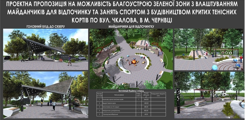 1. Проектна пропозиція на можливість благоустрою рекреаційної зони активного відпочинку з влаштуванням майданчиків для відпочинку, занять спортом та будівництва критих тенісних кортів за адресою вул. В. Чкалова,30 в м. Чернівці.