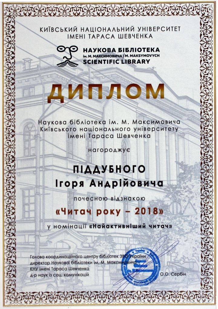 22 березня у Науковій бібліотеці імені Михайла Максимовича Київського національного університету імені Тараса Шевченка відбулося святкування визначної події для читацького загалу та усіх освітян України – урочиста церемонія нагородження переможців Всеукраїнського фестивалю «Читач року – 2018».