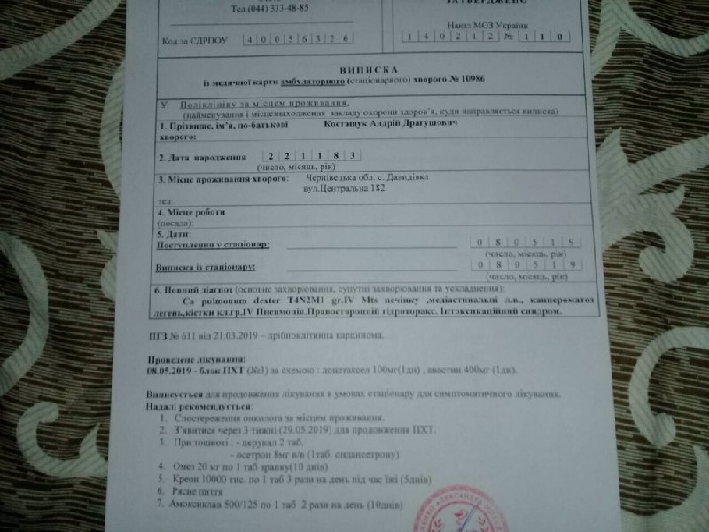 36-річний Андрій Костащук з села Давидівки Сторожинецького району бореться зі страшною недугою - останньою стадією раку легень. Завдяки небайдужим за минулий місяць вдалося зібрати необхідну суму для проведення двох хіміотерапій у київській клініці. Після них стан батька двох дітей значно покращився, а пухлина зменшилася: