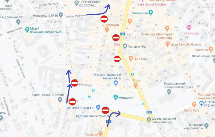Для убезпечення дорожнього руху і охорони громадського порядку у Чернівцях сьогодні ввечері повністю перекриють рух транспорту Соборною площею.