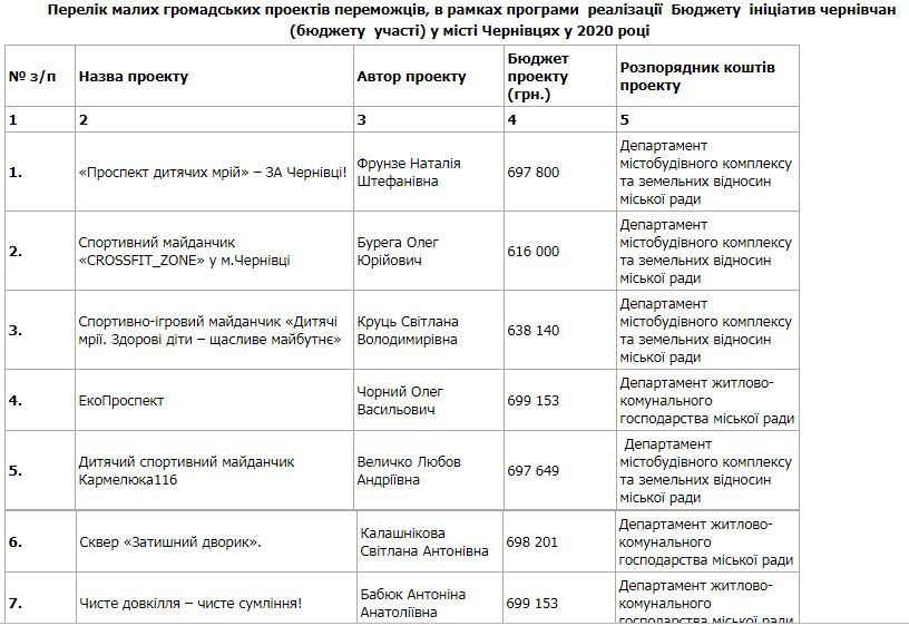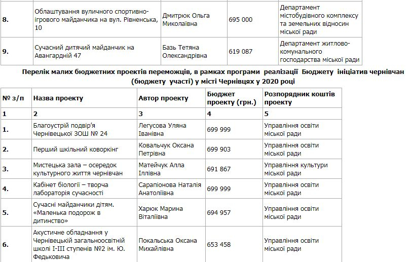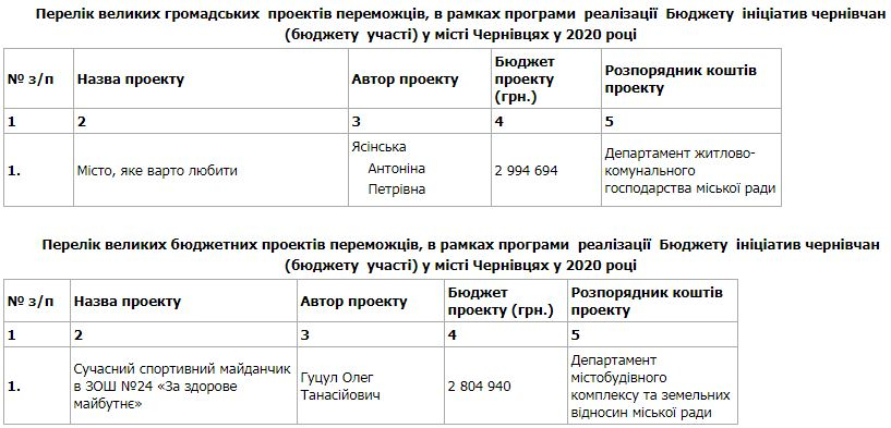 Зокрема, переможцями затверджено 1 проект з категорії «великі громадські», 1 проект в категорії «великі бюджетні», 9 проектів в категорії «малі громадські» та 6 проектів в категорії «малі бюджетні». Повідомляє пресслужба Чернівецької міської ради.