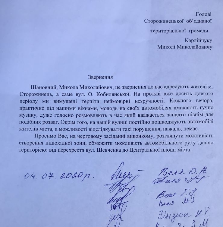 Жителі Сторожинця просять розглянути на наступному засіданні виконкому створення ще однієї пішохідної зони та обмеження руху цією ділянкою вулиці