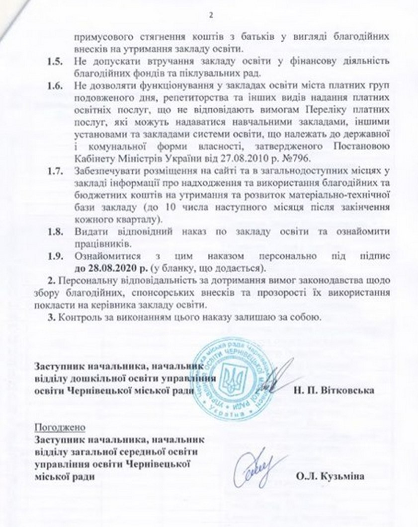 В наказі «Про дотримання чинного законодавства щодо благодійних внесків в закладах освіти міста» йдеться, що керівники закладів освіти мають співпрацювати з батьківськими або громадськими організаціями виключно на добровільних засадах.
