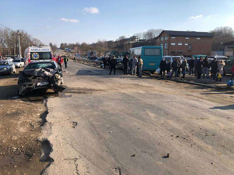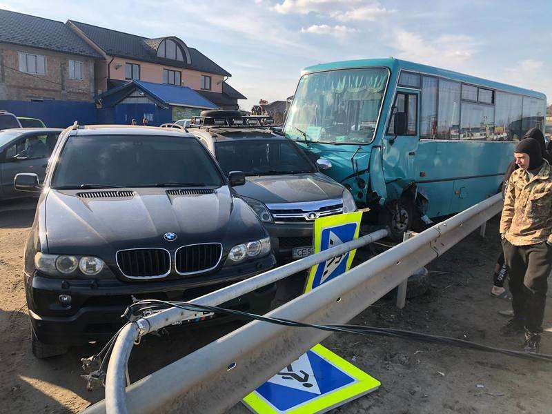 Після зіткнення з легковиком, автобус зніс знак пішохідного переходу та протаранив ще два авто Реклама