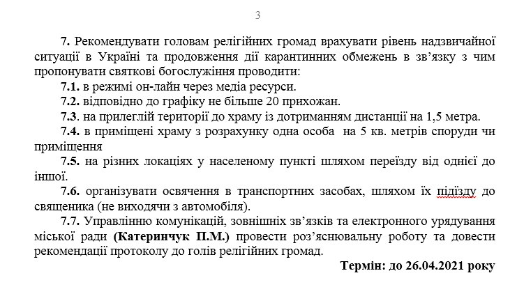 Зокрема, головам релігійних громад, враховуючи рівень надзвичайної ситуації в Україні та продовження дії карантинних обмежень, пропонують проводити святкові богослужіння онлайн, а освячувати кошики прихожан "в транспортних засобах, шляхом їх підїзду до священика (не виходячи з автомобіля)".