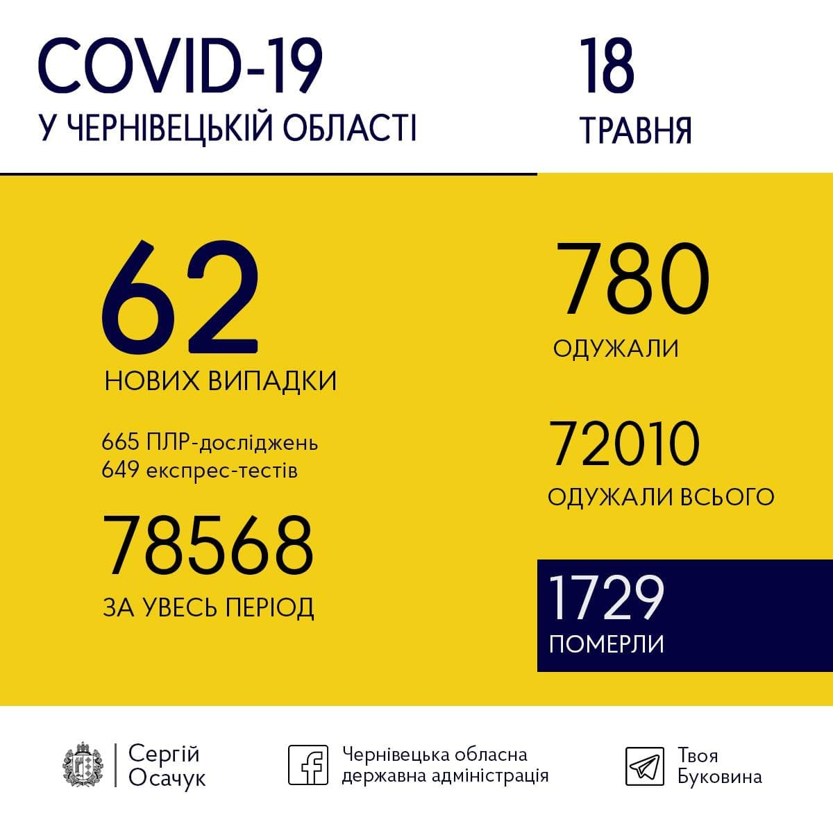 Сьогодні, 18 травня, на Буковині підтвердили ще 62 випадки зараження коронавірусом. Загалом лабораторний центр опрацював 665 ПЛР-тестів та 649 експрес-тестів.