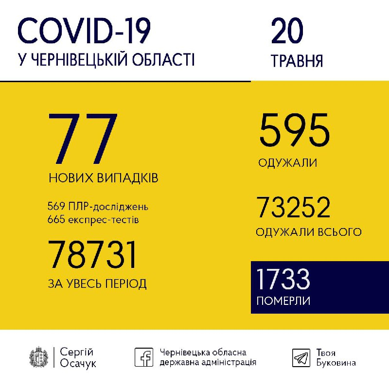 Сьогодні, 20 травня, у Чернівецькій області кількість хворих на коронавірус збільшилася на 77 осіб.