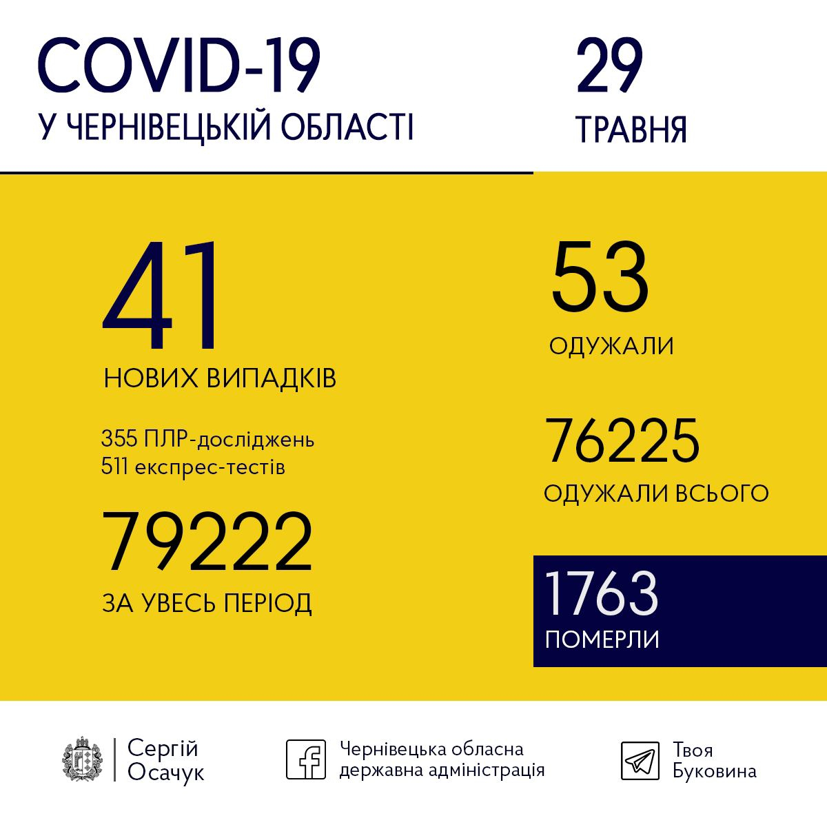 Сьогодні, 29 травня, у Чернівецькій області кількість хворих на коронавірус збільшилася на 41 особу. Загалом, лабораторний центр дослідив 355 ПЛР-зразків та 511 експрес-тестів.