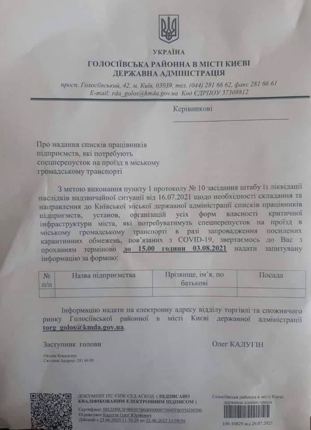 Зокрема, видання оприлюднило лист заступника голови Голосіївської РДА Олега Калугіна, який розіслали підприємцям району. У документі говориться, що до 3 серпня організації всіх форм власності критичної інфраструктури повинні подати списки співробітників, яким будуть необхідні пропуски на транспорт "у разі введення посилених карантинних обмежень".