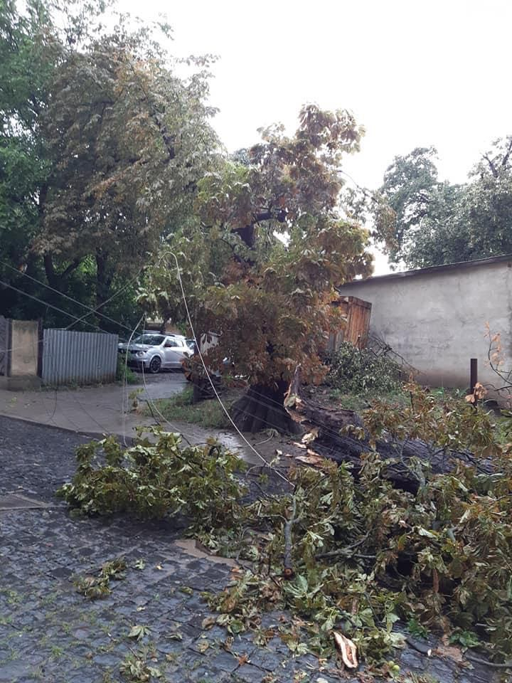 Своїми силами сусіди намагаються розпиляти каштан. Аварійку викликати не можливо. Гілки висять на дротах. Садовського, 7, -написала чернівчанка.