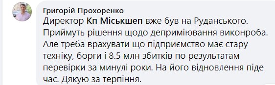 У відповідь керівник Департаменту інфраструктури та благоустрою Георгій Прохоренко пообіцяв депреміювати виконроба і почав жалітись на стару техніку, боргу та збитки МіськШЕПу. Яким чином в неналежній якості проведення ремонтних робіт винна стара техніка, борги та збитки, Прохоренко не пояснив.