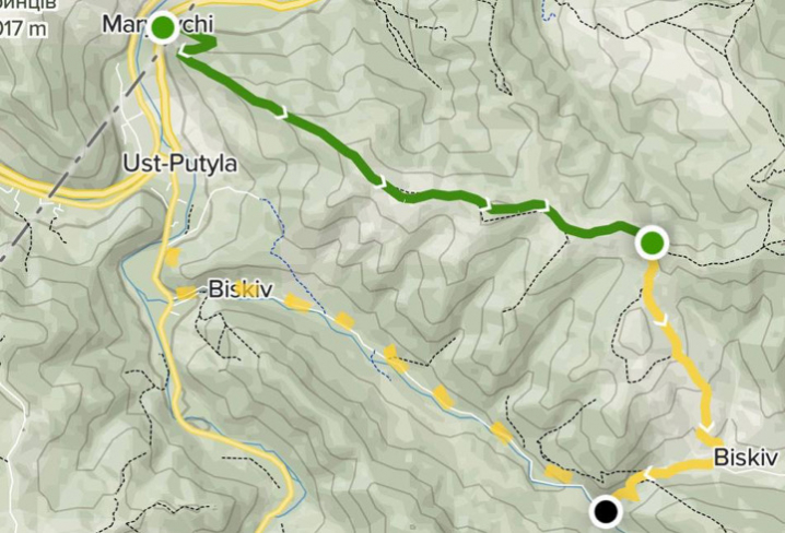Пізніше на початку маршрутів також розташують карти-схеми. Так, зелений маршрут займає 17,5 кілометра. Стартує він від села Мариничі, що в Усть-Путильській громаді, і тягнеться до перевалу Кінашки. Тут мандрівники зможуть насолодитися краєвидами із гір Рижа, Бочків, Лубок та Садниста. За гарної погоди звідси видно Чорногору.
