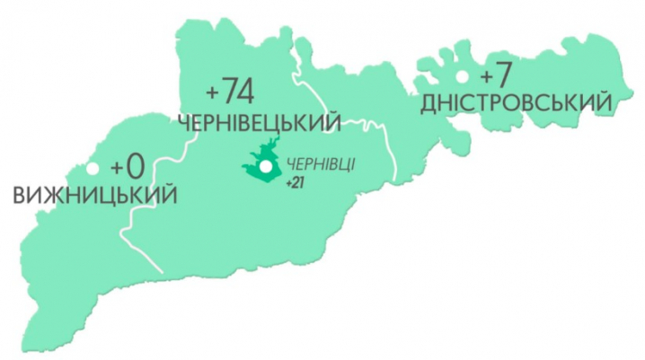 - Чернівецький район +74, із них 21 випадок – у Чернівцях