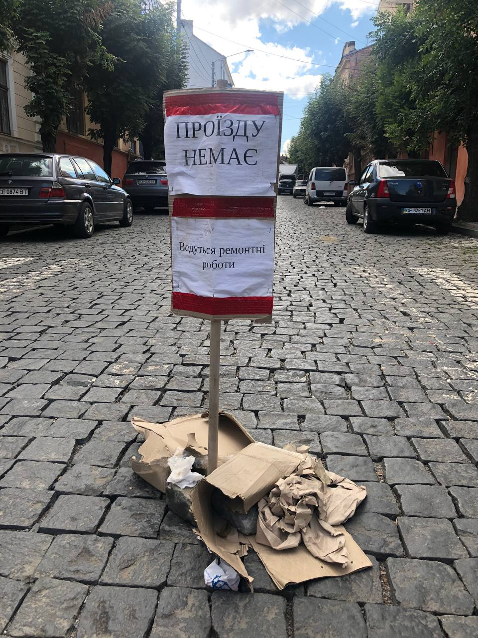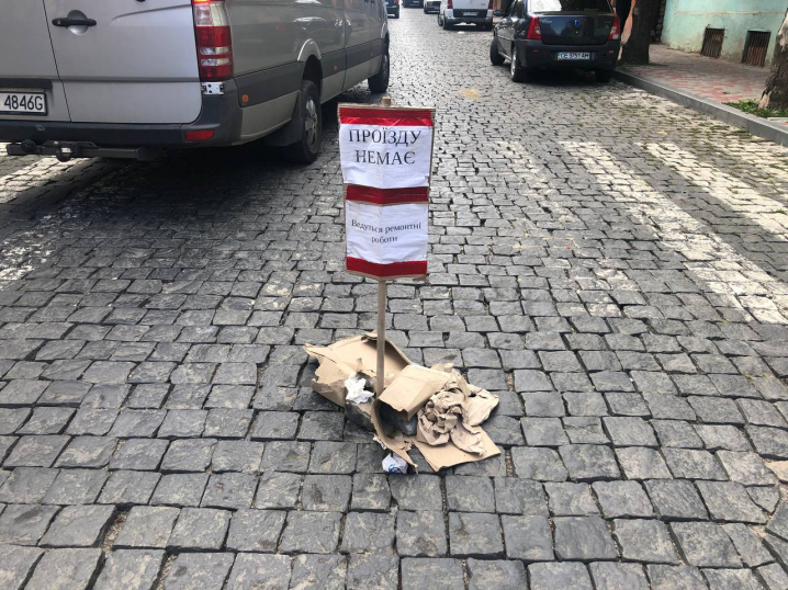 Про те, що вулицю Хмельницького досі перекрито, сповіщає вельми специфічний "дорожній знак", який спорудили зі сміття.