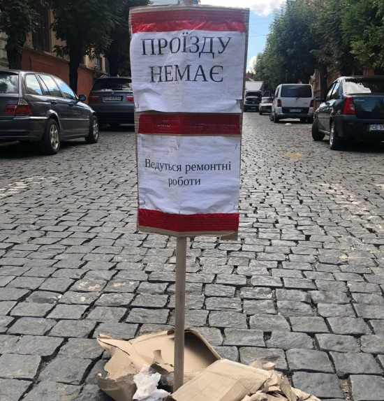 Із сміття і палиць комунальники спорудили табличку "Проїзду немає" і встановили її посеред вулиці