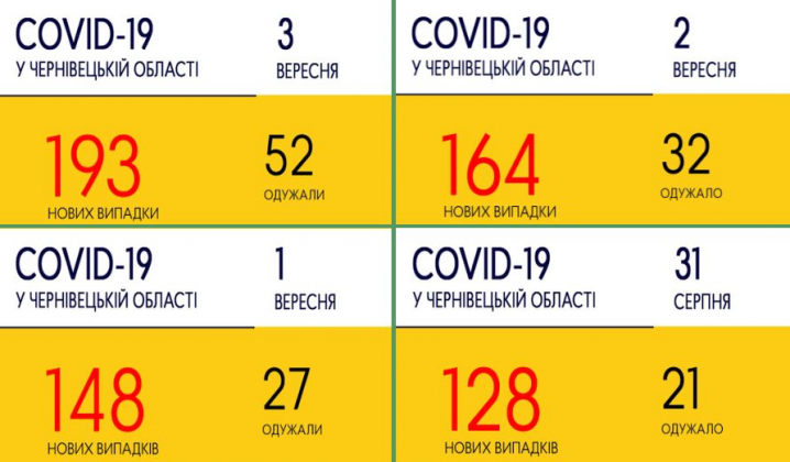 Сьогодні, 3 вересня, у Чернівецькій області кількість хворих на коронавірус збільшилася на 193. Загалом, лабораторний центр дослідив 663 ПЛР-зразків та 903 експрес-тестів.