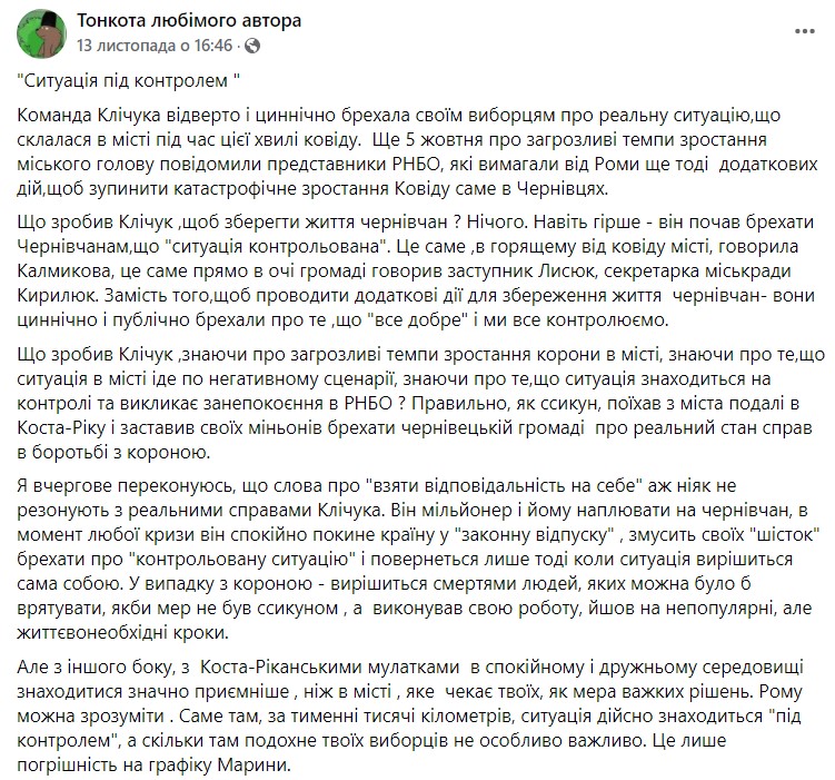 Я вчергове переконуюсь, що слова про "взяти відповідальність на себе" аж ніяк нерезонують з реальними справами Клічука. Він мільйонер і йому наплювати на чернівчан, в момент любої кризи він спокійно покине країну у "законну відпуску" , змусить своїх "шісток" брехати про "контрольовану ситуацію" і повернеться лише тоді коли ситуація вирішиться сама собою. У випадку з короною - вирішиться смертями людей, яких можна було б врятувати, якби мер не боявся, авиконував свою роботу, йшов на непопулярні, але життєвонеобхідні кроки», - зазначають у телеграм-каналі.