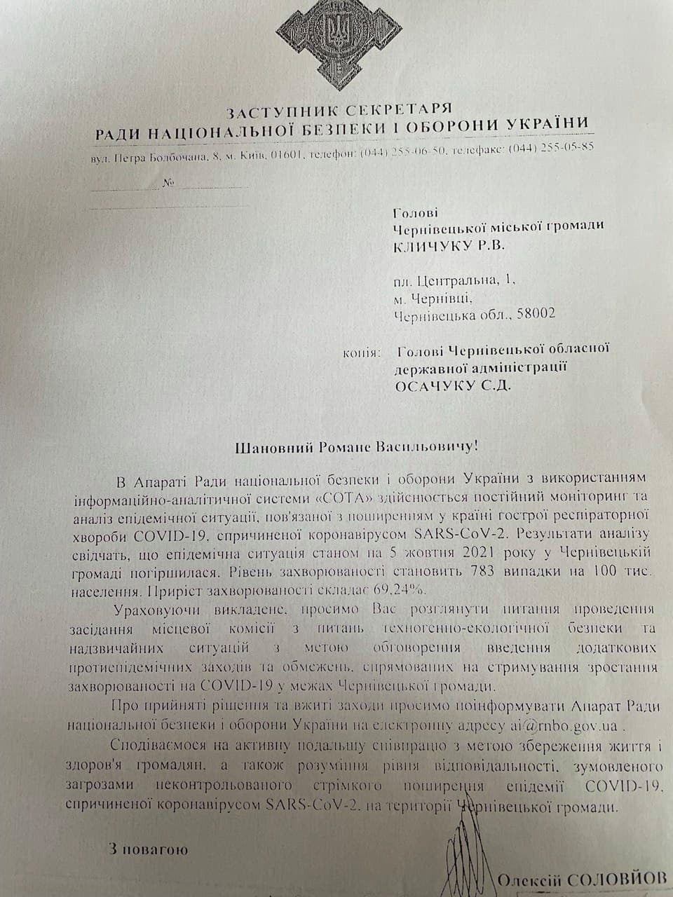 РекламаКоманда Клічука відверто і цинічно брехала своїм виборцям про реальну ситуацію, що склалася в місті під час цієї хвилі ковіду. Адже ще 5 жовтня про загрозливі темпи зростання міського голову повідомили представники РНБО, які вимагали від Клічука ще тоді додаткових дій, щоб зупинити катастрофічне зростання ковіду саме в Чернівцях. Про це йдеться у телеграм-каналі «Тонкота любімого автора», де опублікували лист РНБО до міського голови Чернівців.