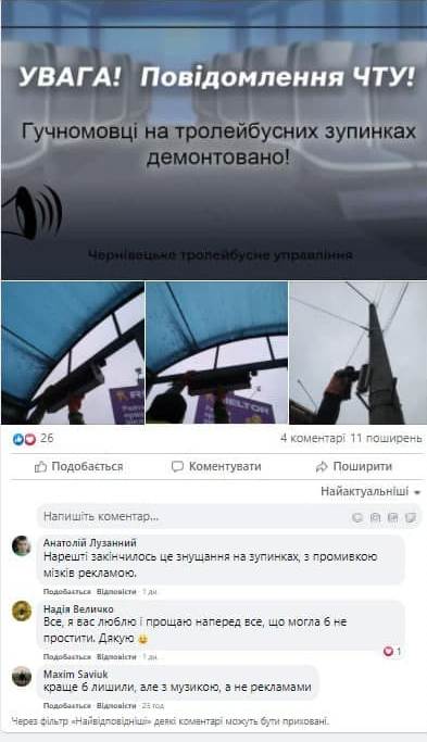 Як останній яскравий приклад маніпуляції, він наводить публікацію у Фейсбуці на офіційній сторінці КП «Чернівецьке тролейбусне управління». Там тролейбусники похвалилися безчинством і одразу у день публікації під постом з’явилися 4 коментарі.
