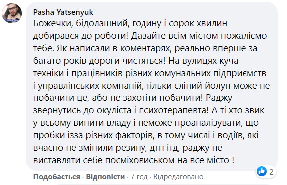 В коментарях до допису йому відповів член команди «Єдина альтернатива», а нині працівник комунального підприємства «МіськШЕП», яке займається саме прибиранням доріг, Павло Яценюк.