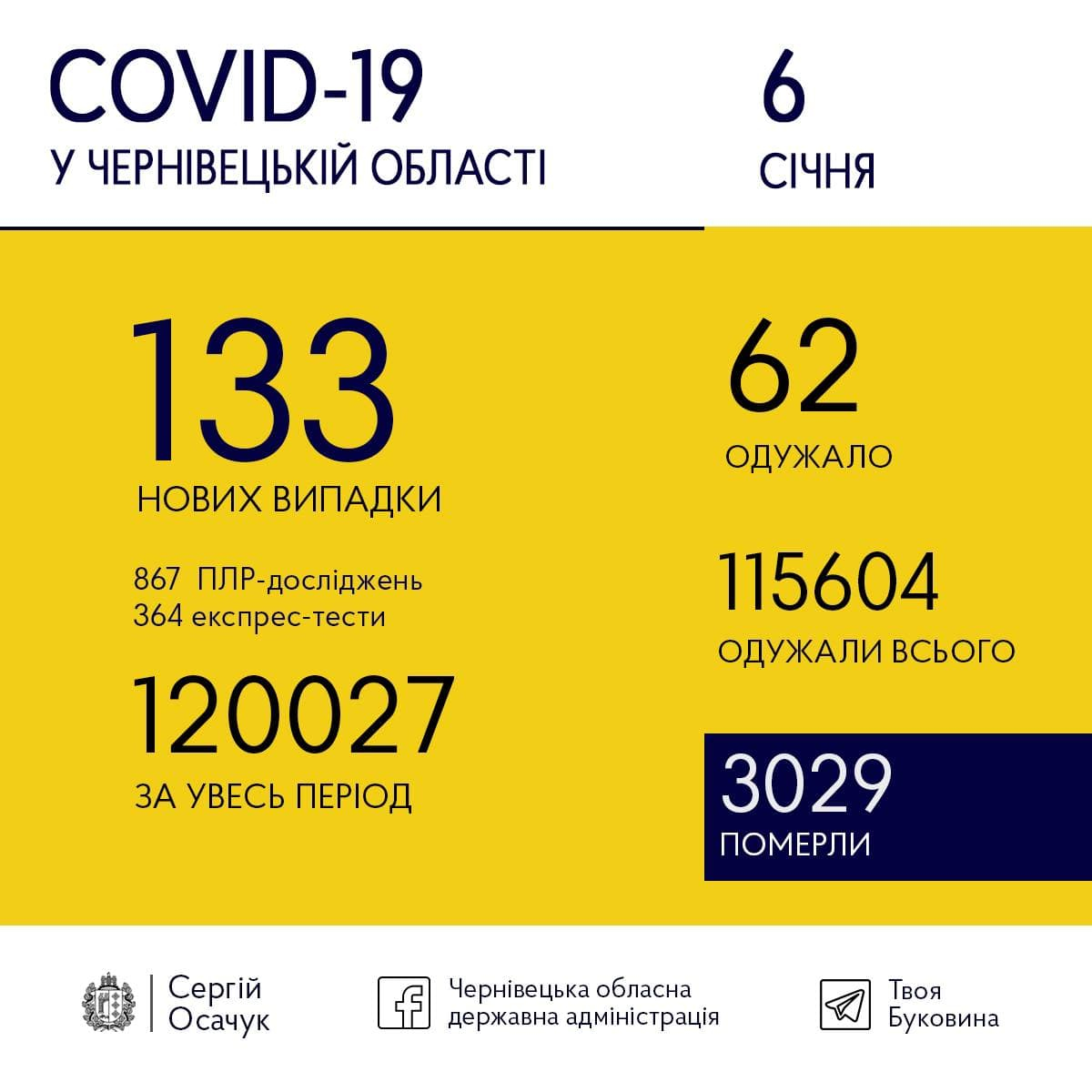 На Буковині минулої доби, 6 січня, офіційно підтверджено 133 випадки зараження коронавірусом.