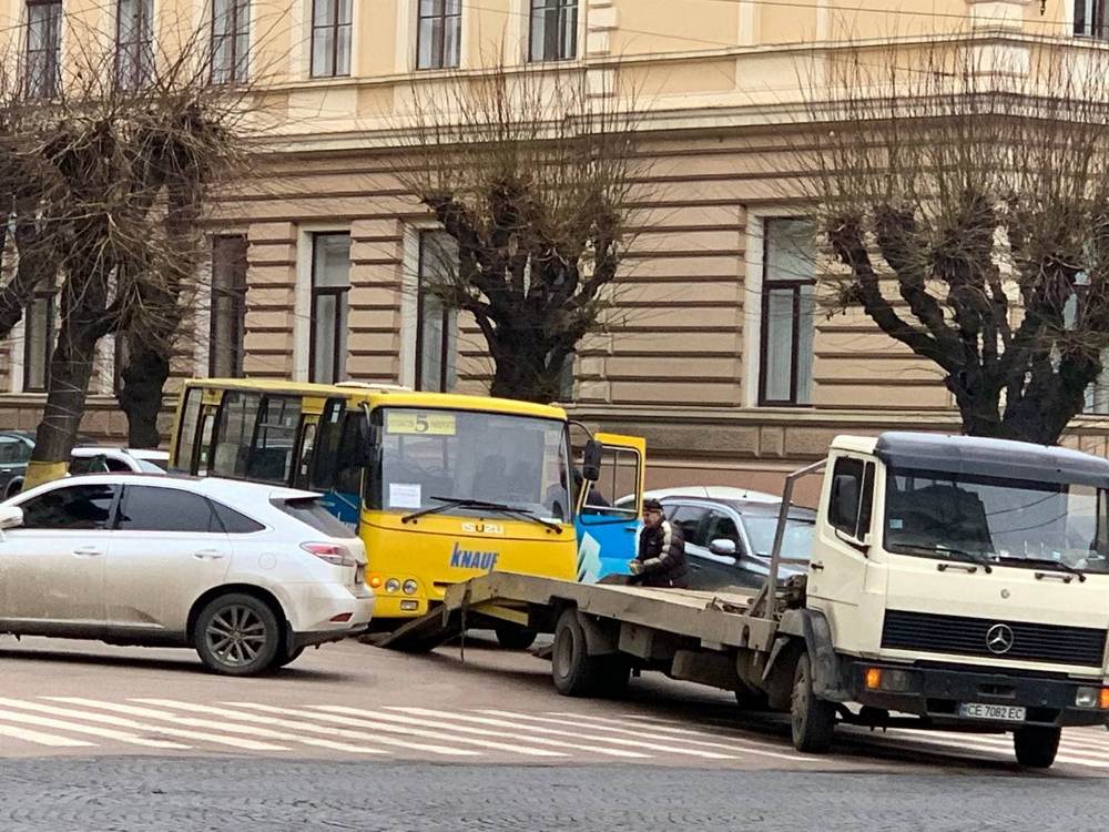 РекламаНа перехресті вулиць Університетська-Сковорода зупинилась маршрутка №5 і не змогла продовжити рух. Через це забирати транспортний засіб приїхав евакуатор.
