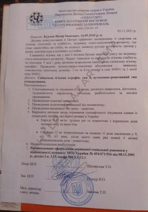 У Назарчика Курчака з села Ошихліби Чернівецької області діагностовано смертельне генетичне захворювання СМА (спінальна м'язова атрофія) 2 типу, яке призводить до атрофії всіх м'язів тіла.