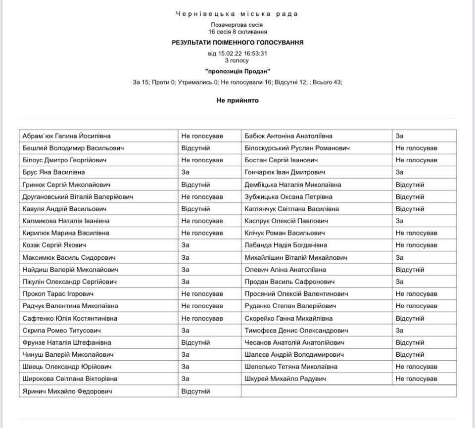 Серед тих хто не проголосував мер Роман Клічук та секретарка міськради Марина Кирилюк, у повному складі депутати «Єдиної альтернативи» Галина Абрам’юк, Дмитро Білоус, Наталія Калмикова, Тарас Прокоп. Валентина Радчук, Руслан Білоскурський, Надія Лабанда. Чотири депутати партії «Пропозиція» Юлія Сафтенко, Степан Руденко, Тетяна Шепелько, Михайло Шкурей. Керівник фракції «Європейська солідарність» Сергій Бостан і навіть представники президентської фракції «Слуга народу» Віталій Другановський та Олексій Просяний, які зрештою синхронно голосують з більшістю Клічука, навіть якщо це антипрезидентські ініціативи чи звернення.