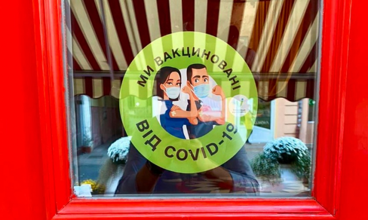 Для позначення безпечного простору в закладах харчування Чернівецька обласна державна адміністрація запровадила наліпки «Ми вакциновані від COVID-19».