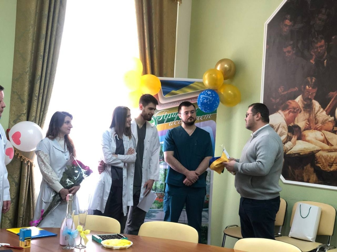 Шлюб в умовах воєнного стану засвідчив керівник лікарні. Молодим подарували імпровізований торт і поки символічні подарунки.
