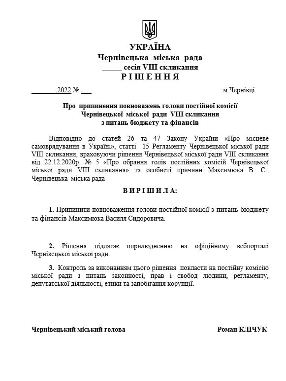 Голова постійної комісії Чернівецької міської ради VІІІ скликання з питань бюджету та фінансів Василь Максимюк складає свої повноваження.
