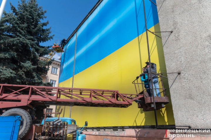 У Чернівцях на Центральній площі встановили новий банер. Раніше за пам’ятником Кобзарю розміщувалось полотно, на якому було зображено історичну довідку про наше місто. Нині ж тут красується символ України - величезний синьо-жовтий стяг