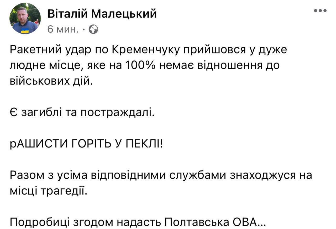 Мер Кременчука Віталій Малецький повідомляє, що внаслідок ракетних ударів по місту є загиблі та постраждалі. За його словами, ракетний удар було завдано по дуже людному місці.