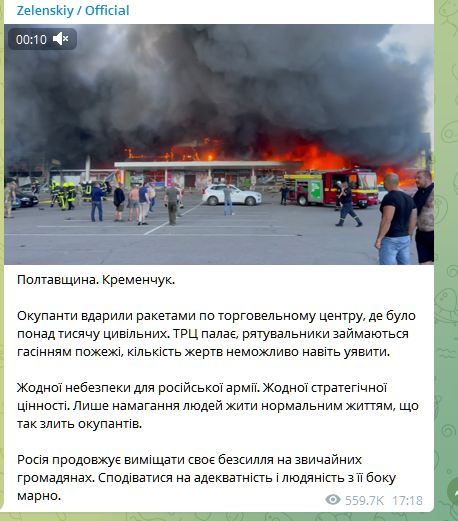 Президент Володимир Зеленський оперативно відреагував на завданий удар по торговому центрі у місті Кременчук, що на Полтавщині. Він повідомив, що у ТЦ перебувало понад 1000 цивільних людей.
