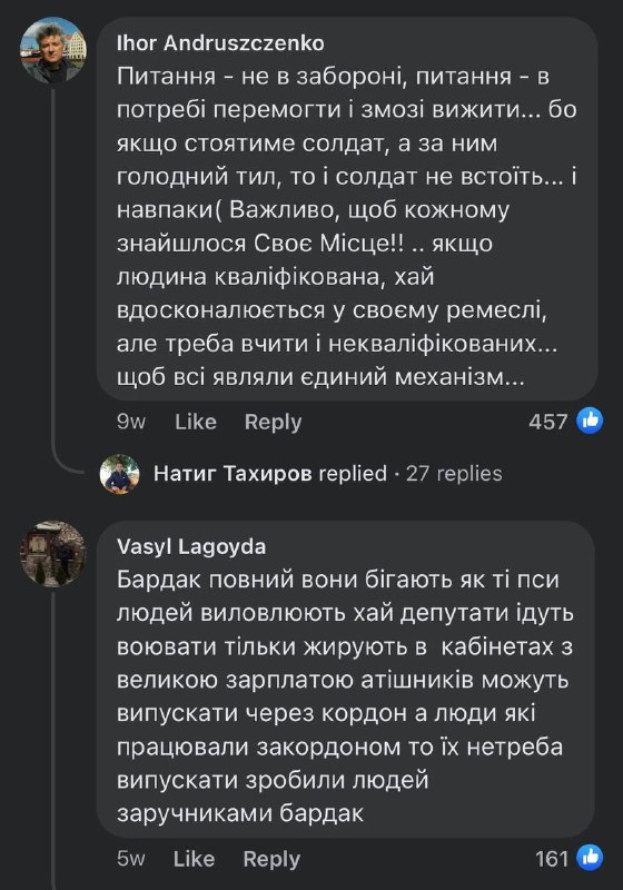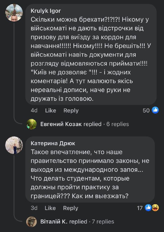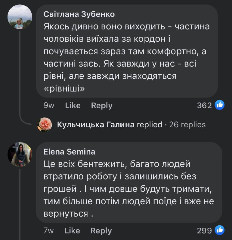 У соцмережах підіймається хвиля обурення через заборону виїзду чоловіків за кордон. Зокрема у численних коментарях до дописів на вищезгадану тему люди висловлюють невдоволення такими обмеженнями.