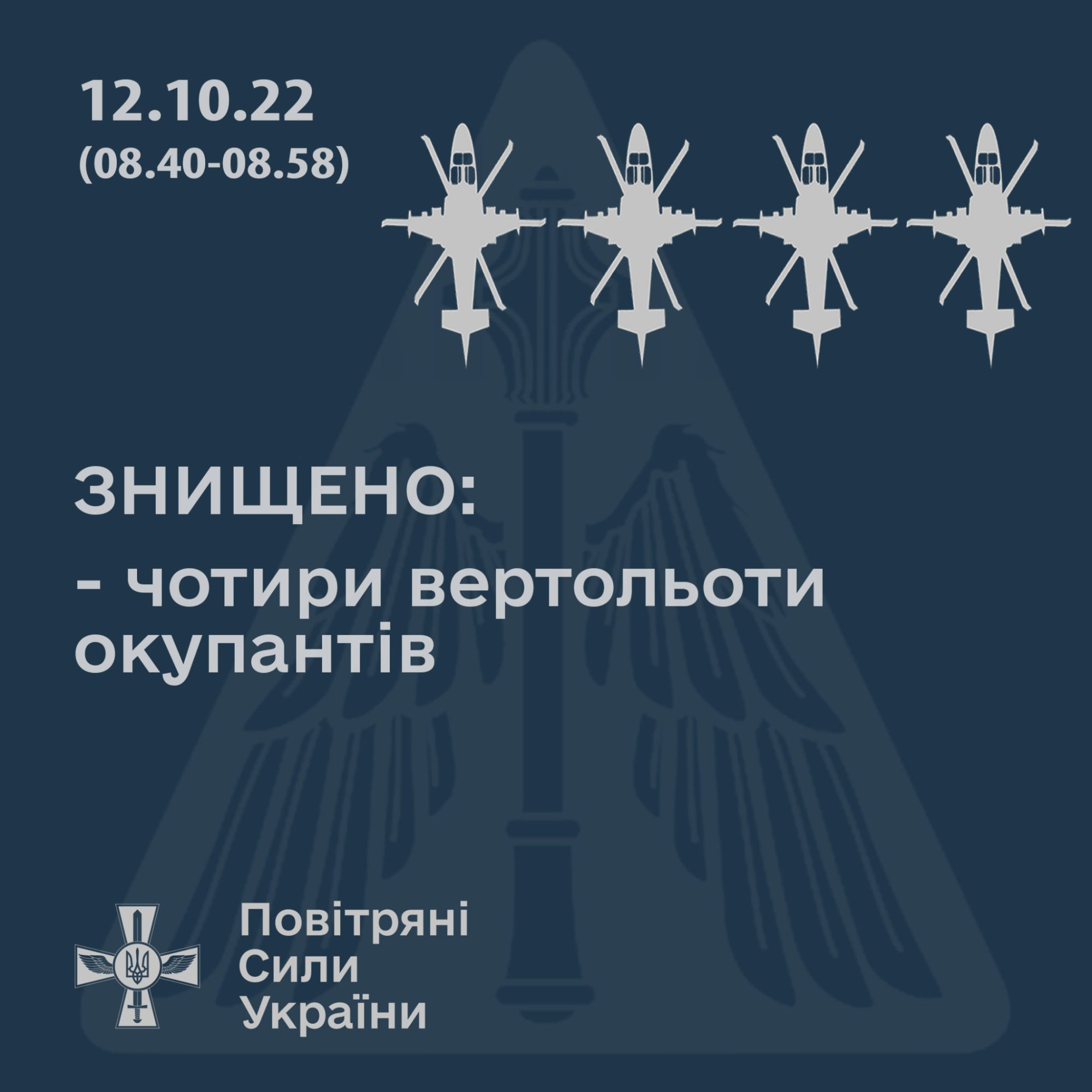 «З 8.40 по 8.58 12 жовтня на півдні України зенітними ракетними підрозділами Повітряних Сил знищено щонайменше чотири ударних вертольоти противника (імовірно Ка-52), які здійснювали вогневу підтримку наземних окупаційних військ на південному напрямку», - йдеться у повідомленні.
