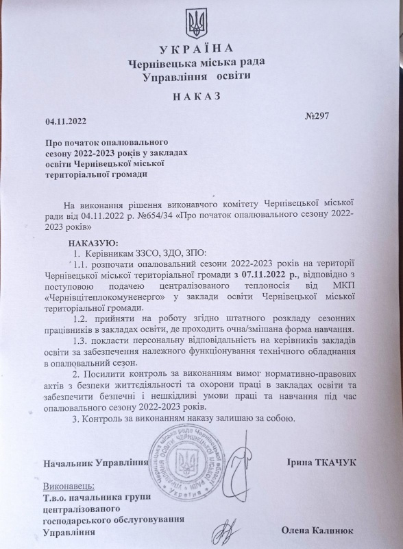 Наказ про початок опалювального сезону у закладах освіти Чернівецької громади оприлюднили і в управлінні освіти.