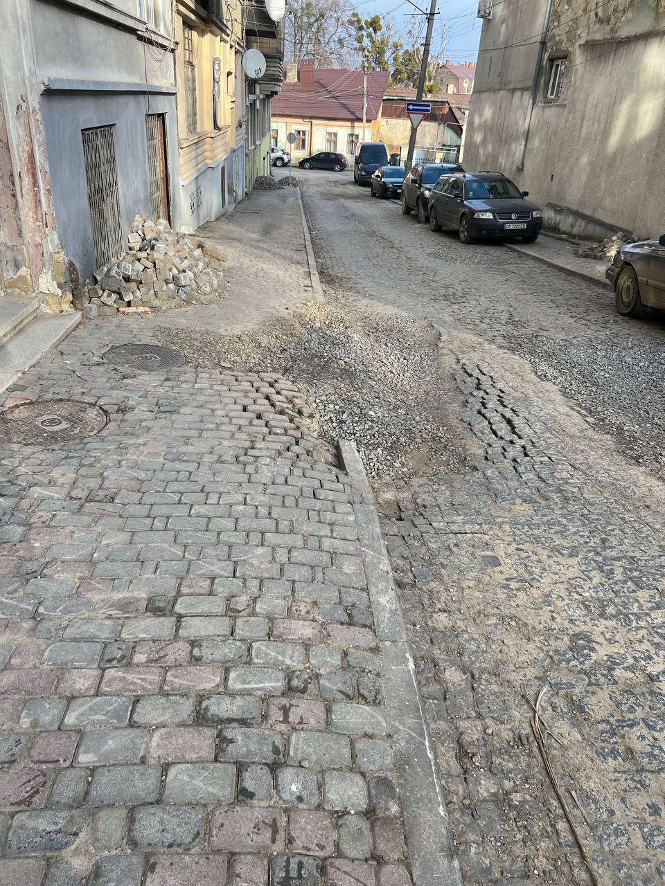 На фото видно, що бруківка, яка має бути вимощена на дорозі, валяється обабіч на тротуарі.