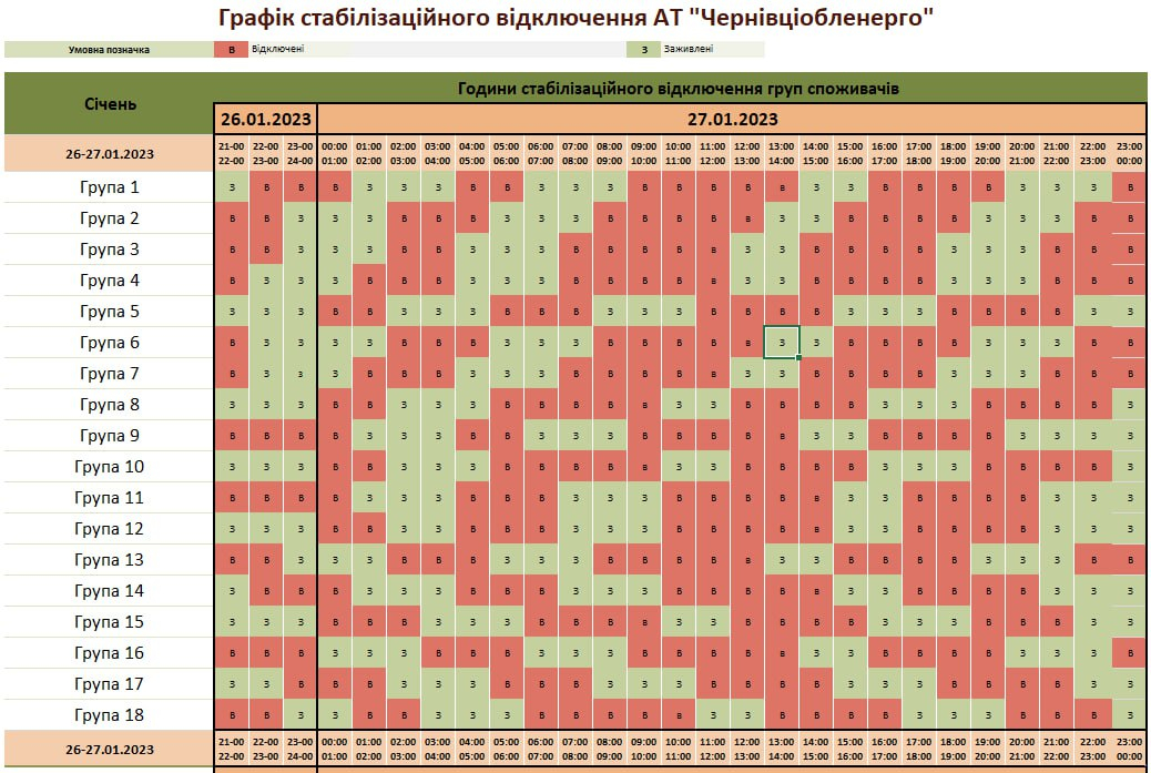 Оновлений графік погодинних відключень для Чернівецької області на 25 січня