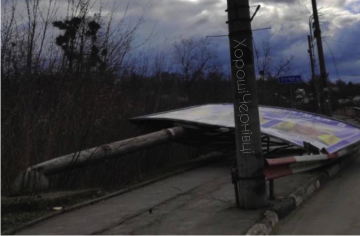 У Чернівцях біля мосту над Прутом від шквального вітру впав білборд. Металева конструція не витримала поривів вітру та впала обабіч дороги.