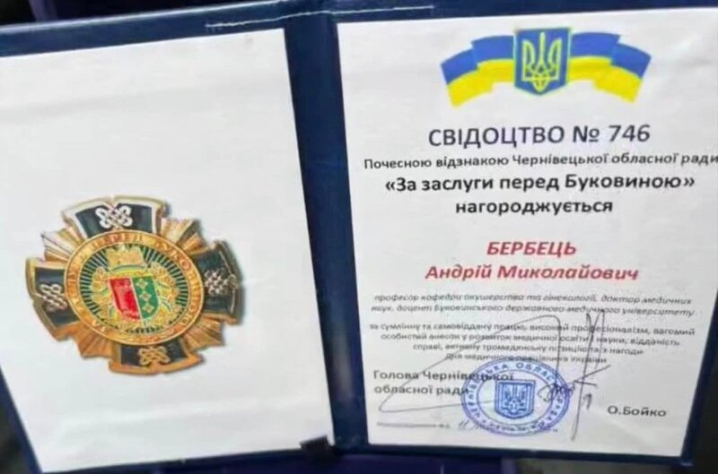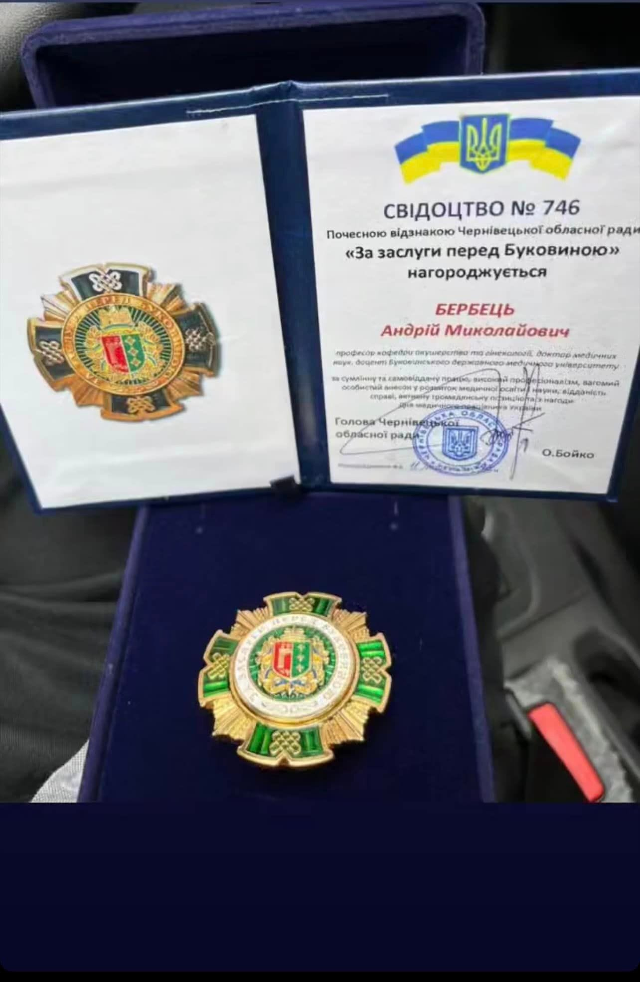 Викладач та лікар акушер-гінеколог Андрій Бербець отримав почесну відзнаку «За заслуги перед Буковиною». Нагороду отримав його син.