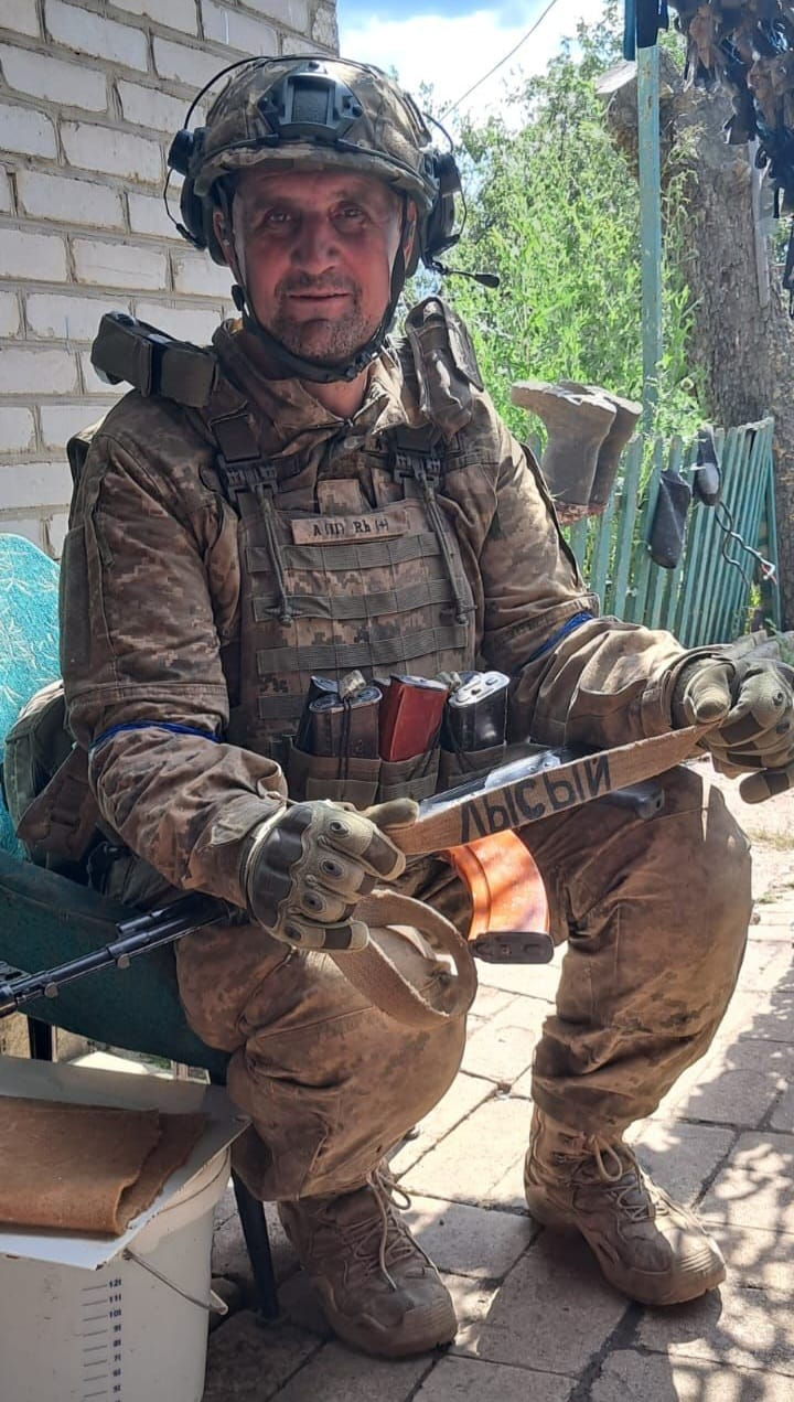 Військовослужбовець 92 об 107 обр ТрО ЗСУ Леонід Тимко з позивним «Мойсей» (ред. На фото з трофейною зброєю) батько трьох дітей, до війни був фермером, а нині командир відділення.