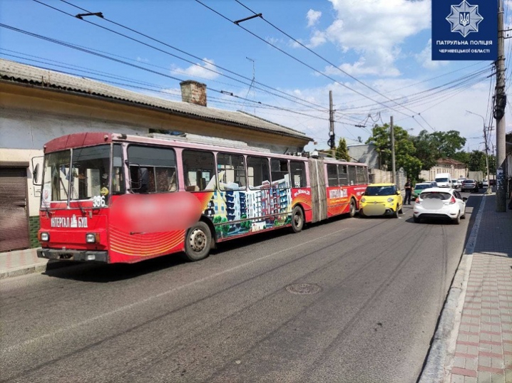 Біля кінотеатру Чернівці тролейбус "притиснув" легковика до паркану.
