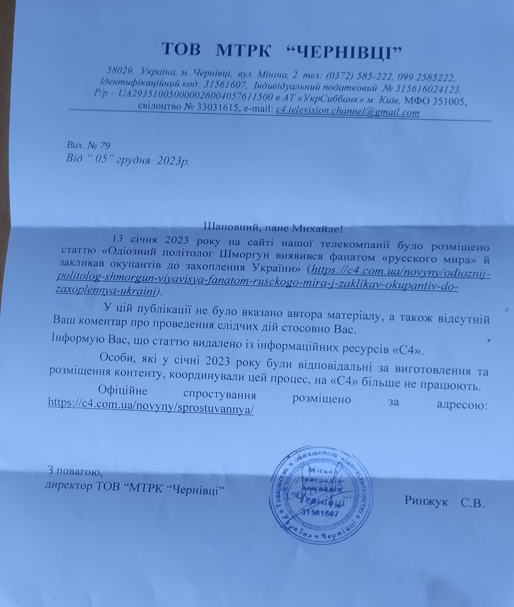 Телеканал C4 вибачився перед політологом Михайлом Шморгуном за наклеп.